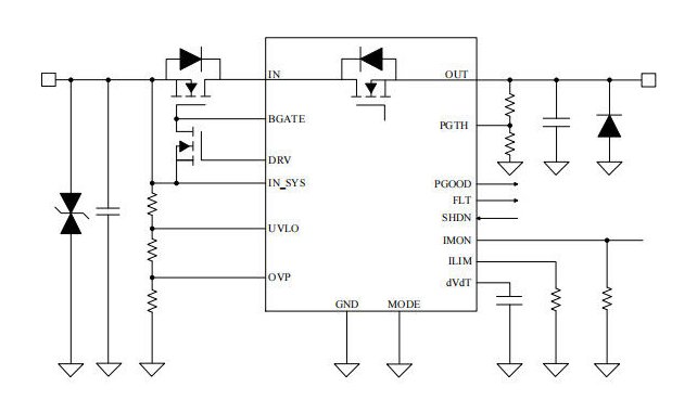 ♦ Adjustable UVLO, OVP cutoff, output slew rate control for inrush current limiting