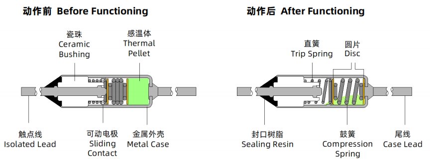 Under normal operating temp., the solid thermal pellet keeps the isolated lead connected to the sliding contact. When the Thermal-Link senses abnormal heat and temp. reaches the predetermined fusing temp., thermal pellet melts and the sliding contact separates from the isolated lead with the assistance of trip spring, thereby the circuit is disconnected.