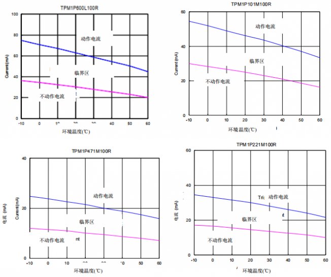 | Tc (℃) | R25 (Ω) | IN (mA) | IT (mA) | Vmax (VDC ) | Imax (mA) | TL~TU (℃) | ||||